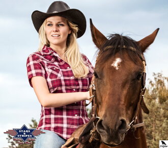 (JOSIE)Károvaná westernová blúzka s krátkymi rukávmi a výšivkou na hrudi a chrbte, našitými náprsnými vreckami, patentnými gombíkmi a saténovým lemom pri výstrihu, zapínaním na gombíky a chlopňami na vreckách. Hodí sa ku košeli JEFF BLUE